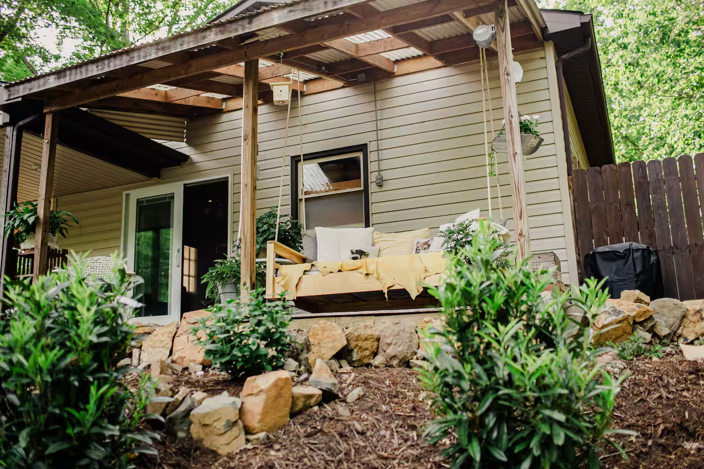 The exterior of the guesthouse is fully equipped for enjoying the area. Multiple seating spaces and tables offer cozy spots to chat and enjoy your morning coffee (or nighttime hot chocolate). Under the awning, you’ll also find a picnic table and an adorable bed swing (my favorite spot).